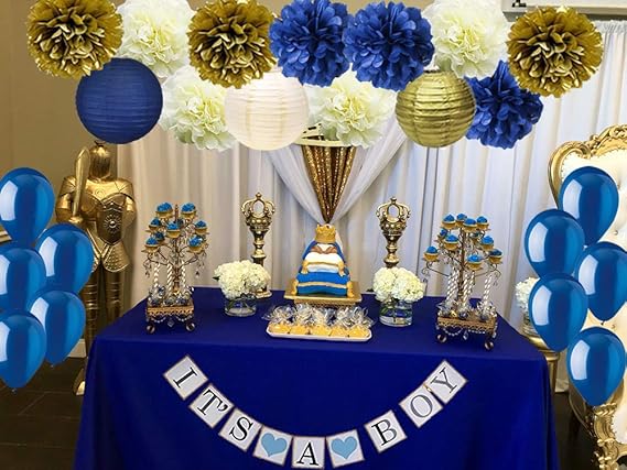 Navy Blue Baby Shower Decorations Navy Blue Cream Gold Tissue Paper Flowers Pom Poms Paper Lanterns For Royal Prince Birthday Graduation Bridal Shower