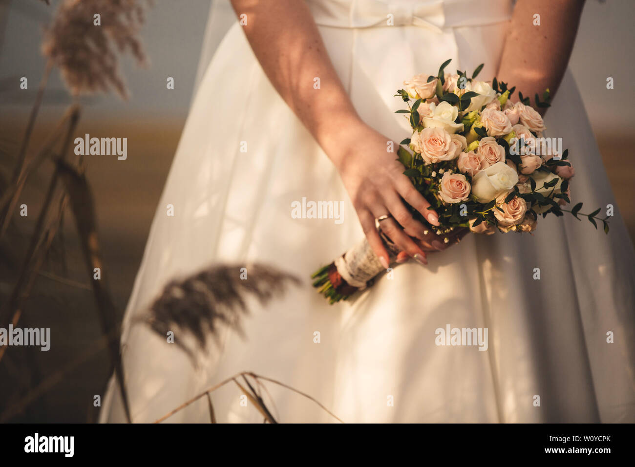 The Bride In An Elegant Wedding Dress Holds A Beautiful