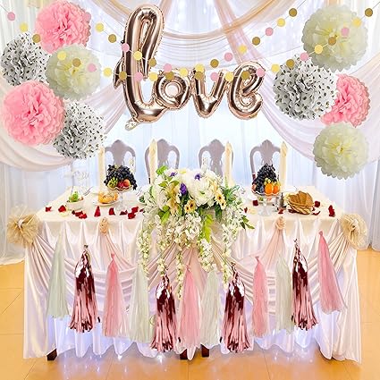 Bridal Shower Decorations Love Balloons Rose Gold Tissue Paper Pom Poms Flowers Tassel Paper Garland Pink And Rose Gold Party Supplies Kit