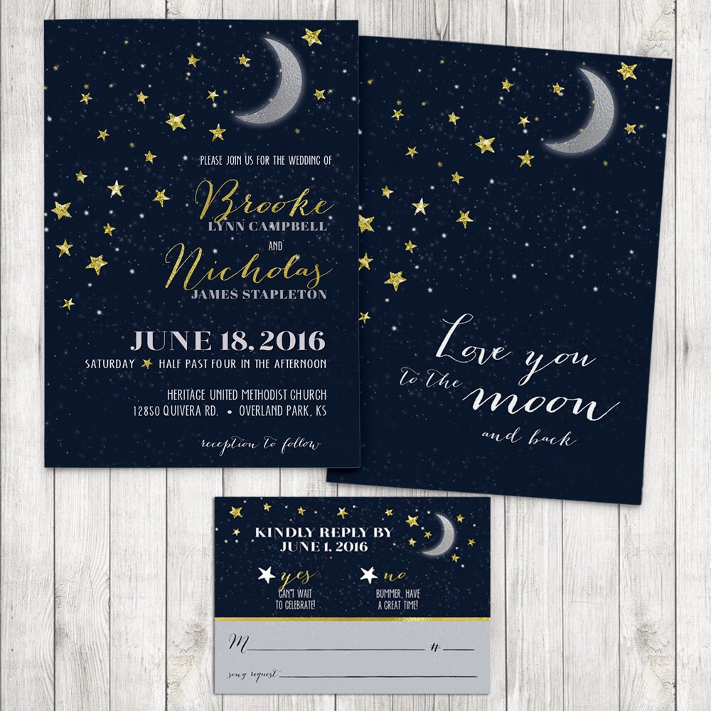 Love You To The Moon And Back Wedding Invitation Moon And Stars Invitation And Rsvp Card Navy Blue And Gold Invitation Suite Printable