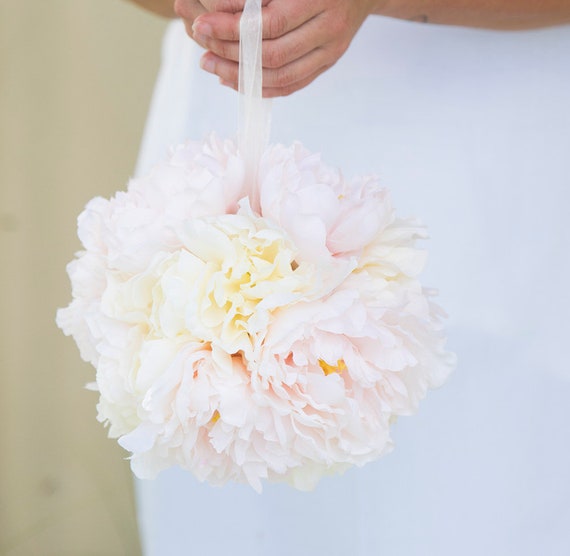 Blush Peach Ivory Peonies Wedding Flower Girl Pomander Ball Peony Centerpiece Pink Flower Ball Pink Flower Girl Peony Bouquet