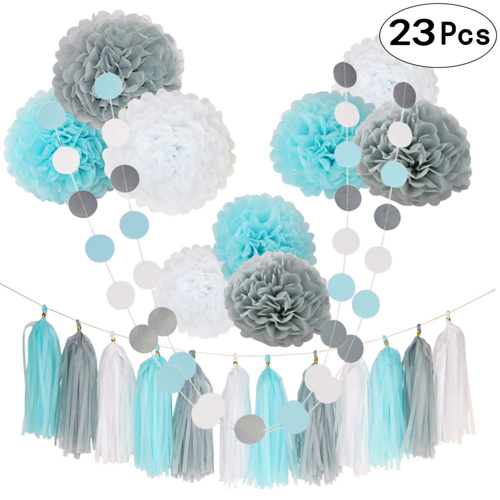 23 Pcs Blue Gray White Happy Birthday 1st Baby Shower Party Wedding Favors Hanging Decorations Kit With Paper Tissue Flowers Tassel Hangings And Dots