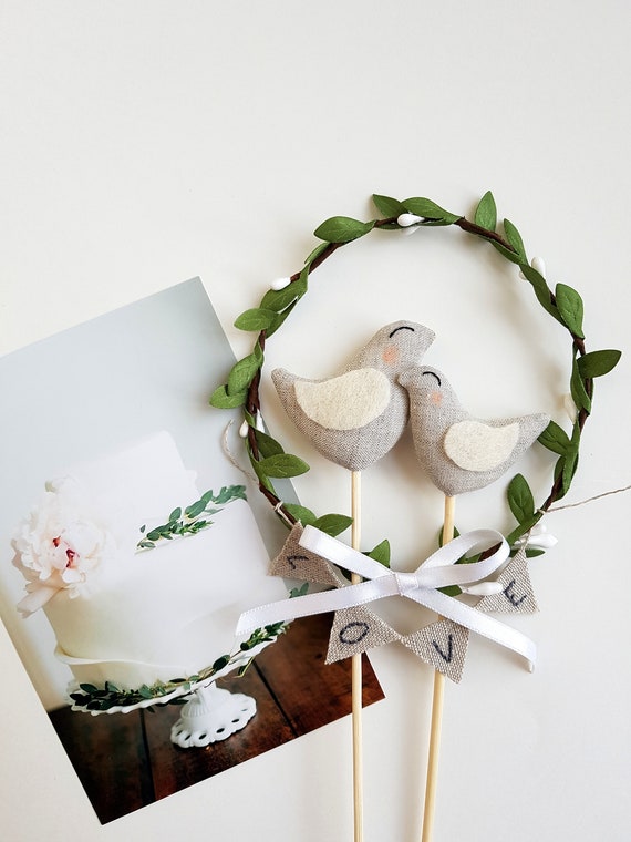Love Birds Wedding Cake Topper With Green Wreath And Banner Love Elegant Linen Birds Cake Topper For Rustic Woodland Forest Wedding Theme
