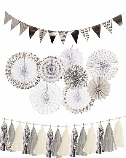 Silver Engagement Decorations Silver Paper Fans Decorations Sparkly Paper Pennant Banner Triangle Flags Tissue Paper Tassels Garland Silver Party