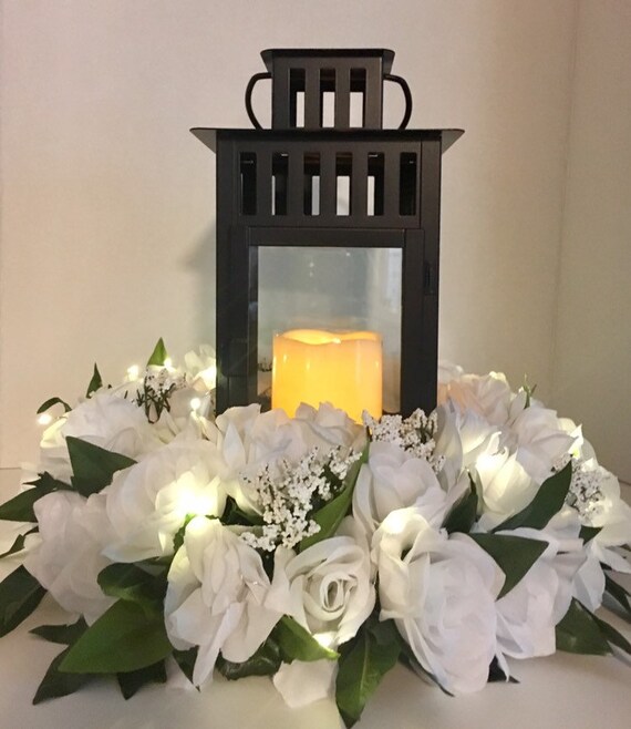 White Faux Rose Centerpiece For Ikea Lantern Or Large Candle W Led Mini Lites Wedding Lantern Not Included