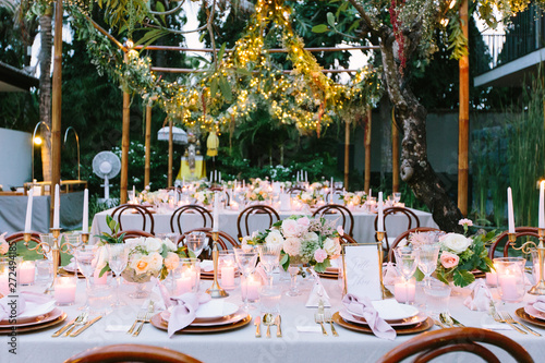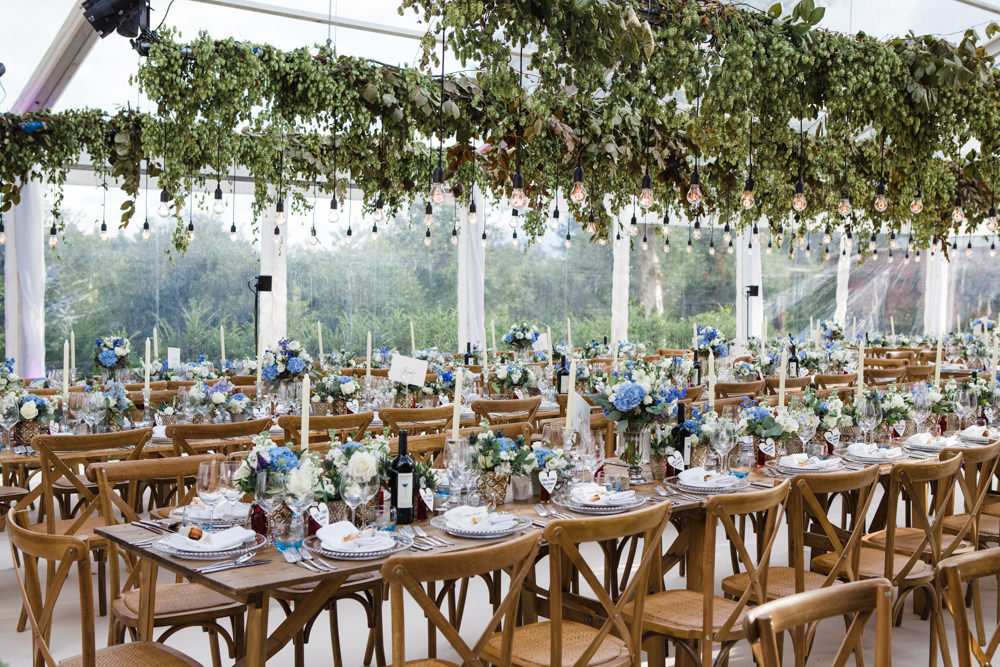 Outdoor Tropical Wedding Reception With Hanging Greenery