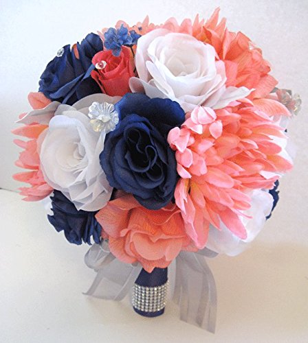 17 Pcs Wedding Silk Flower Bouquet Bridal Package Coral Navy White Silver Centerpiece Decorations Rosesanddreams