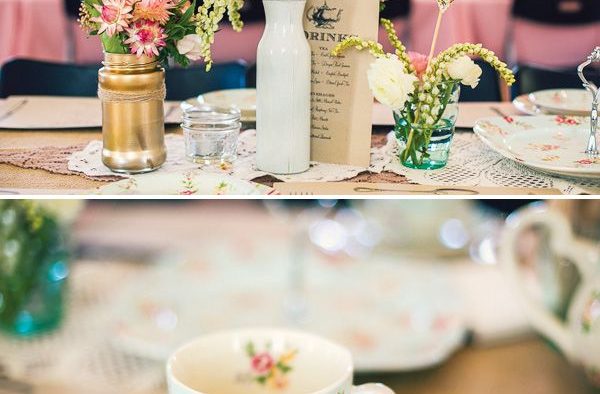 If you are going vintage choose vintage tea cups make centerpieces of vintage tea pots with blooms add pearls and rock a lace table runner. Tie each napkin with a beautiful ribbon bow. For single use silver plated is an inexpensive option.