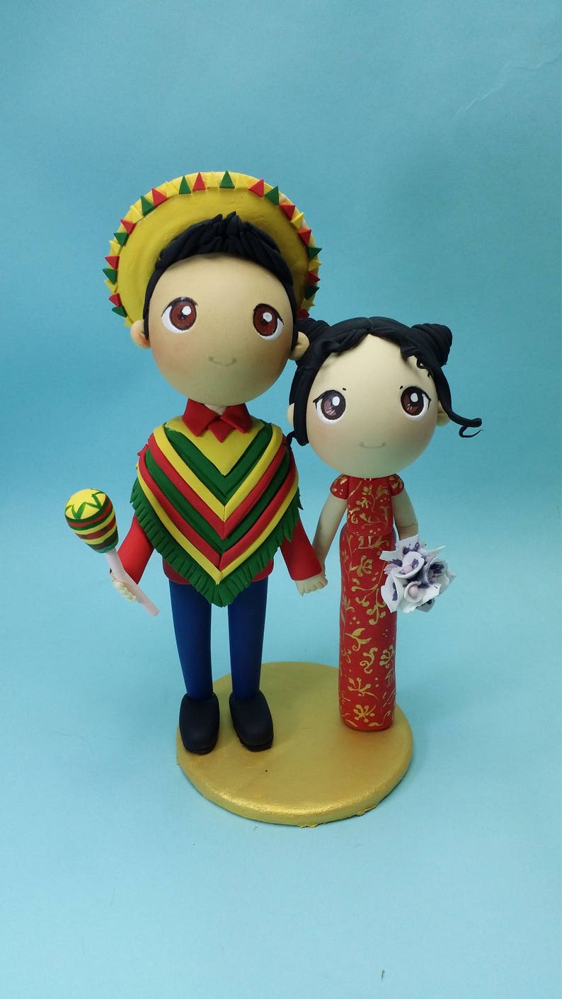 Mexican And Chinese Wedding Cake Topper Clay Figurine International Wedding Clay Miniature Wedding Decoration