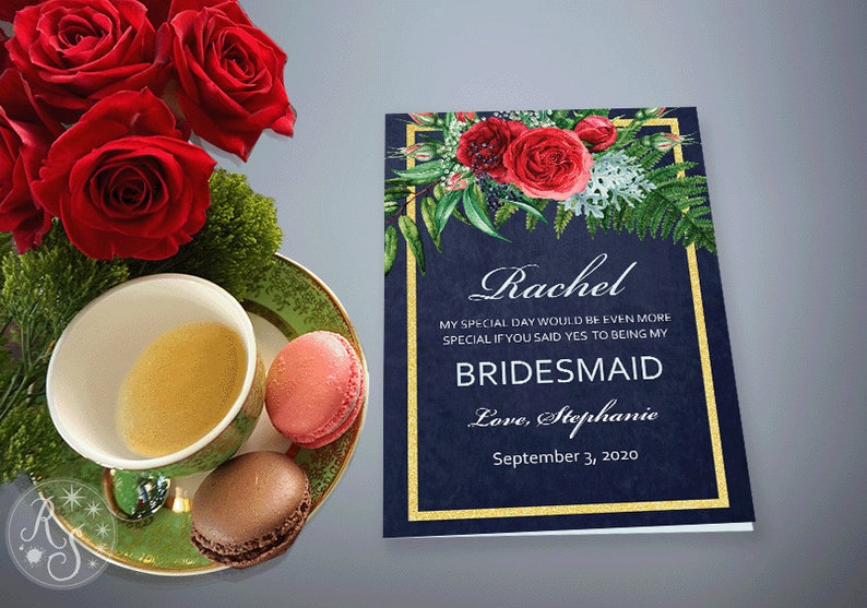 Bridesmaid Proposal Card Winter Wedding Theme Gold Red Dark Blue With Rose Flowers