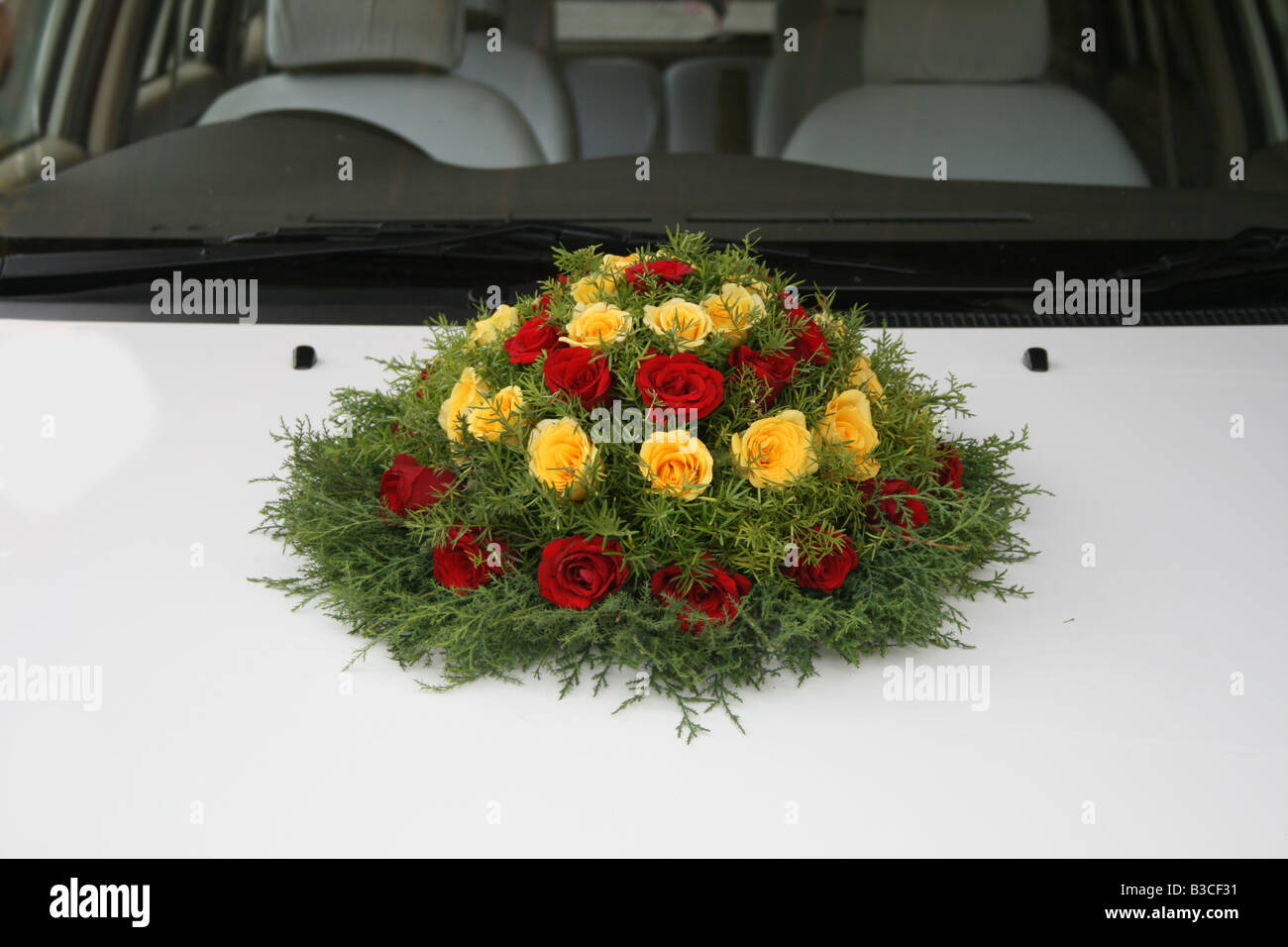 Wedding Bouquet Decorated On White Car For Bridegroom And