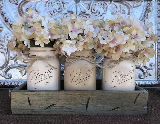 Mason Canning Jar Kitchen Farmhouse Table Centerpiece With 5 Hand Painted Ball Quart Jars In Distressed Wood Tray Rusty Handles Antique White Red
