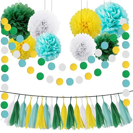 Heartfeel Yellow Green White Aqua Blue 30pcs Tissue Paper Pom Poms Tassel Garland Kit For Wedding Bridal Shower Decorations Birthday Party Decor