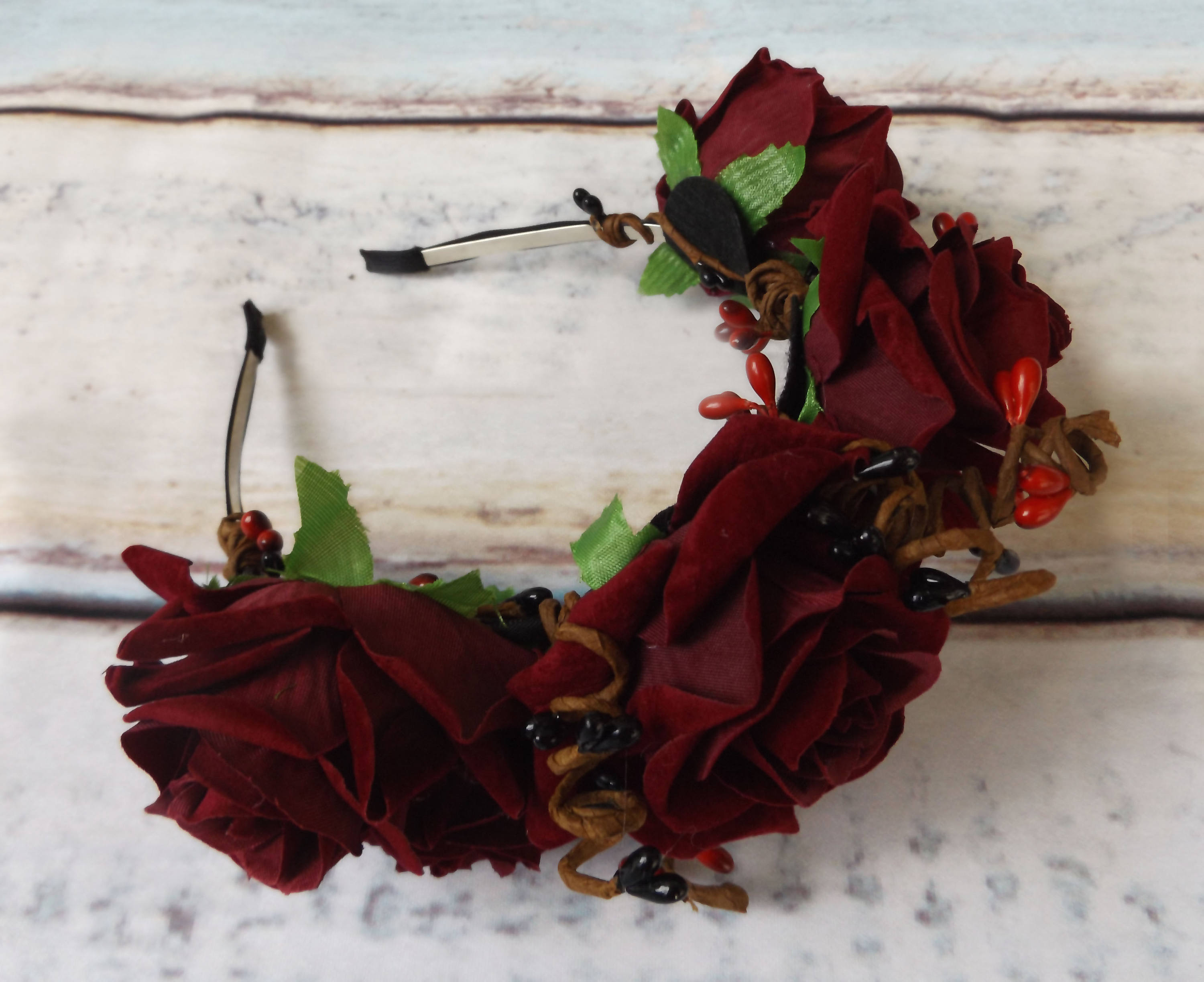 Asymmetrical Hair Flower Crown Burgundy Black Twisted Vine Berry Rose Floral Garland Wreath Boho Bohemian Festival Bridal Wedding Bride