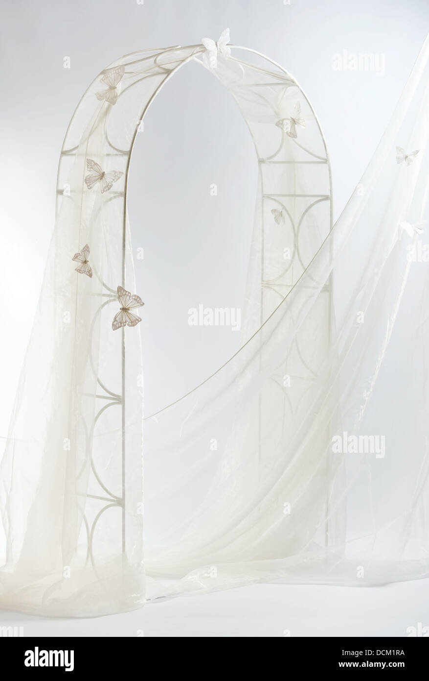 You can simply add large white butterflies to a basic iron or metal arch by gluing them on. While the prospect of attaching a flower arrangement to the arch can seem daunting its relatively easy especially if youre prepared to build the arrangement on site and have the right supplies in hand. Create an butterfly themed arch of wrought iron which will serve as a beautiful backdrop for your wedding pictures.
